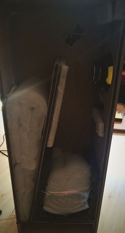 Dann muss vor dem Aufleimen der zweiten Seitenwand die Dämpfung eingebracht werden. In dem Zuge kann auch gleich die Innenverkabelung für die Töner verlegt werden, weil die später nur schwer an der Bedämpfung vorbei gelegt werden kann. Dann unbedingt noch die Eckleisten (ca. 4,5 x 8cm) zur Unterfütterung der Schallwand einleimen, damit man später beim Anbringen der Fasen auf der Schallwand kein Loch produziert. Letztlich wird dann die zweite Seitenwand aufgeleimt. Nach der Trocknung des 'Rohbaus' werden die großen Fasen angebracht und die Box gefinisht. (Tipp: eine Anleitung zum Furnieren gibt es hier.) Wenn das gelungen ist, werden nur noch die Chassis in die Schallwand und die Weiche in den Sockel unter der Linie eingebaut.