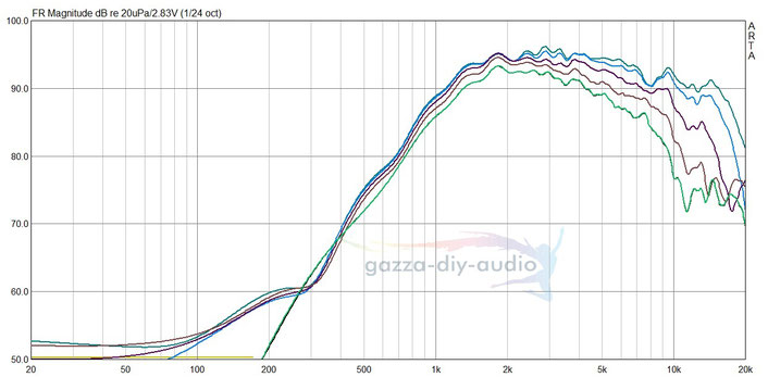 Das ist extrem linear bei weit nutzbarem Frequenzbereich. Auch bzgl. des vermutlich zu betreibenden Beschaltungsaufwandes zauberte uns der gemessene FG ein Lächeln ins Gesicht. Als Spielpartner für den SPH-174KE hatte uns Björn Westphal von Monacor die bekannte Kalotte DT-140 ans Herz gelegt. Zu dieser Kalotte mus man wissen, dass sie eine bauartbedingte schmalbandige Störung bei ca. 8kHz aufweist, die je nach Exemplar mal mehr mal weniger stark ausgeprägt sein kann. Diese zu vernachlässigende Störung machte uns allerdings weniger Sorge als die Position der Kalotte auf der Schallwand, denn dabei fanden wir keine Position, in der die DT-140 zu unserer Zufriedenheit spielte. Letztlich konnten wir in einer Schallwand mit großen Fasen der DT-140 einen Frequenzgang entlocken, der sich auf Achse sowie unter Winkeln vorzüglich präsentiert: