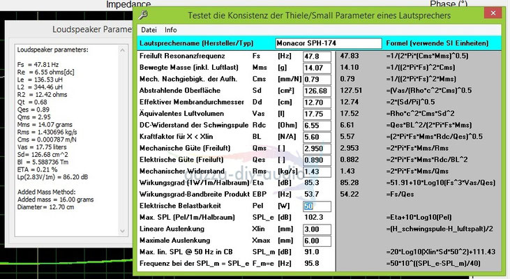 Vor einigen Wochen machte mich mein Freund und DAU-Mitglied Alex (Donhighend) darauf aufmerksam, dass Monacor einen neuen Tiefmitteltöner mit Kevlar-Mambran im Portfolio hat. Zu diesem Zeitpunkt waren auf der Website des Herstellers grobe Angaben zum Chassis zu finden; die angegebenen TSP waren in sich aber nicht konsistent. (Monacor hat die TSP inzwischen korrigiert.) Glücklicherweise konnten wir über die Facebook-Gruppe des akustischen Untergrunds Kontakt zu Monacor herstellen und wenige Tage später, dank der Unterstützung von Monacor, als einige der Ersten in Deutschland ein Paar der neuen Kevlar-Chassis in den Händen halten. Ich habe dann sofort das Messequipment angeschmissen und den Chassis 'auf den Zahn gefühlt'. Folgende Parameter, die in sich konsistent sind, wurden ermittelt: