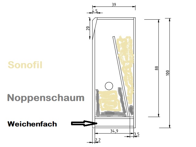Für die Bedämpfung benötigt man pro Box zwei Matten Sonofil und eine Matte Noppenschaum. Die Sonofil-Matten werden in 21cm breite Streifen geschnitten. Mit einer Matte wird der Keil bedämpft, mit der anderen Matte der akustische Sumpf ausgekleidet. Der Noppenschaum wird ebenfalls in entsprechender Breite geschnitten. Zwei schmale Streifen finden im Keil unter dem Sonofil Platz, der Rest bildet den 'Rahmen' des akustischen Sumpfs unterhalb des Chassis.
